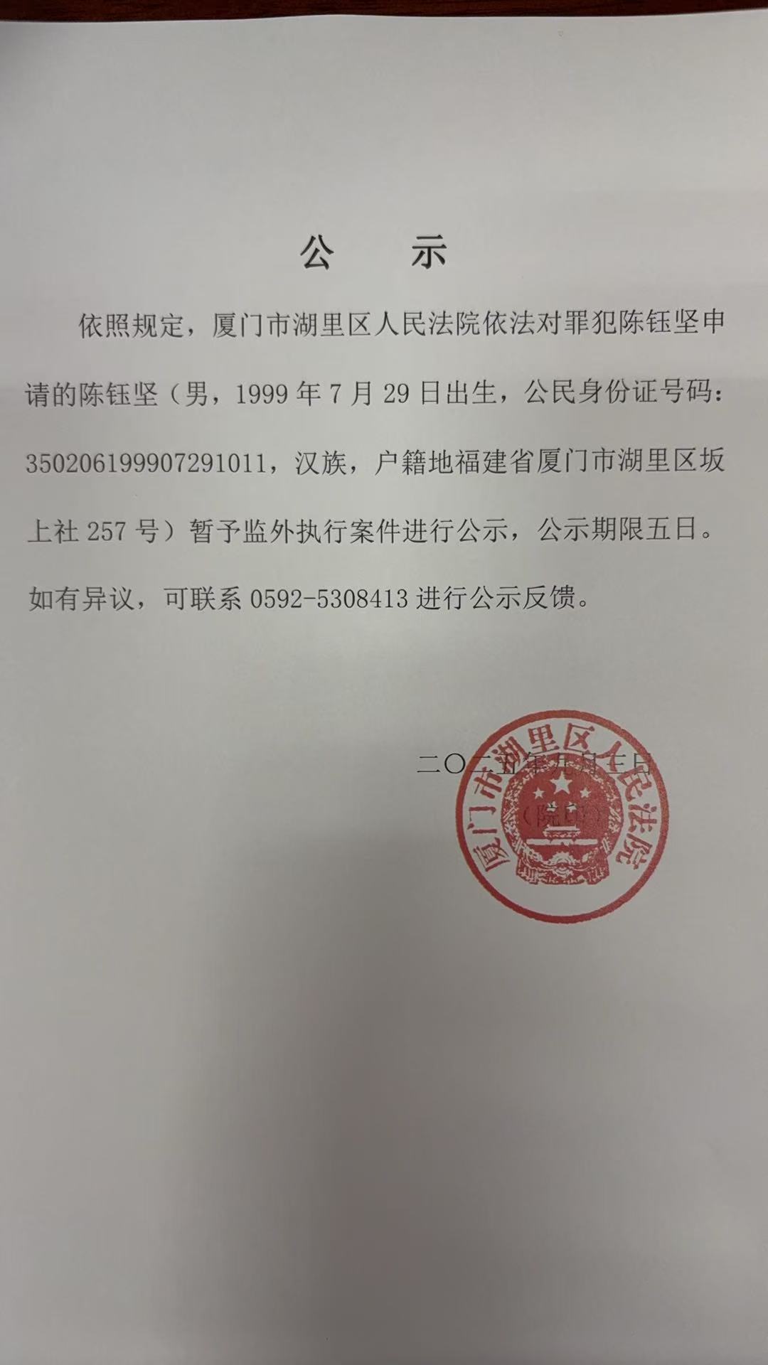 罪犯陈钰坚暂予监外执行一案公示